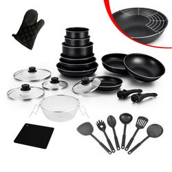 Batterie de cuisine 25 pièces en aluminium composée de 4 poêles 20cm, 24cm, 28cm et 30cm + 3 casseroles avec couvercle 16cm, 18cm et 22cm + 1 sauteuse avec couvercle 26cm + 1 wok 28cm + 2 poignées amovibles + 6 ustensiles en nylon (cuillère à spaghetti + cuillère + louche + spatule fendue + écumoire) + 1 panier en acier inoxydable + 1 égouttoir à huile + 1 gant en coton et silicone + 1 sous plat en silicone. Revêtement intérieur ultra résistant antiadhésif. Tous feux dont induction.