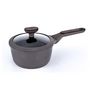 Casserole en fonte d'aluminium, un matériau léger, excellent conducteur de chaleur et très résistant. Les revêtements intérieur (noir effet pierre) et extérieur sont anti-adhésifs pour un nettoyage facile, le manche en bakélite est très agréable au toucher. Couvercle en verre avec bord silicone pour une étanchéité totale. Tous feux dont induction. Casserole diamètre 18 cm.