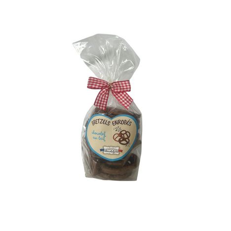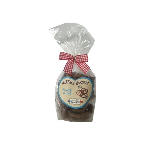 Ingrédients : bretzel (farine de BLE, huile de tournesol, sel, extrait de malt d’ORGE, levure, correcteur d’acidité : hydroxyde de sodium), sucre, beurre de cacao, LAIT en poudre, pâte de cacao, LACTOSE, poudre de LAIT écrémé, émulsifiant : lécithines (SOJA); arôme naturel. Cacao : 14% minimum.