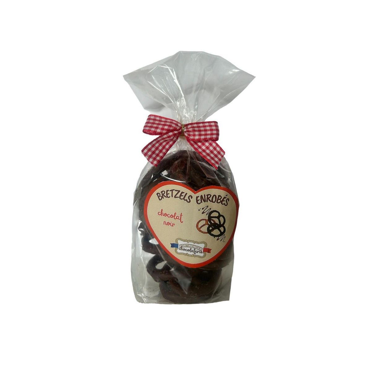 Ingrédients : bretzel (farine de BLE, huile de tournesol, sel, extrait de malt d’ORGE, levure, correcteur d’acidité : hydroxyde de sodium), masse de cacao, sucre, beurre de cacao, émulsifiant : lécithines (SOJA); arôme naturel de vanille. Cacao : 24% minimum.