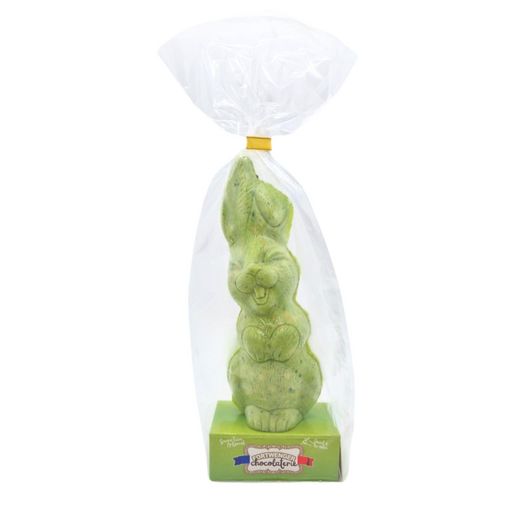 Moulage de chocolat blanc et pistache décoré forme lapin