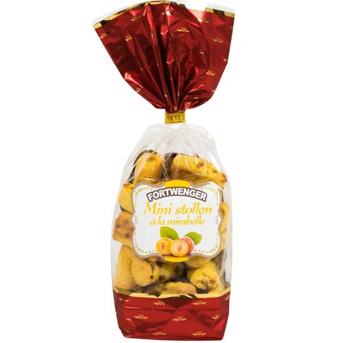 Ingrédients : farine de blé (GLUTEN), beurre (LAIT), sucre, OEUFS, purée concentrée de mirabelle de Lorraine (8,2%), poudre d'AMANDES, alcool de fruits (2,8%vol), sirop de glucose-fructose, sirop de glucose, sirop de sucre inverti cristallisé, fibres de blé (GLUTEN), arôme naturel de mirabelle (0,7%), arôme naturel de vanille, poudres à lever : diphosphates, carbonate acide de sodium ; huile de tournesol, colorant : curcuma ; humectant : sorbitols ; substances naturelles aromatisantes.