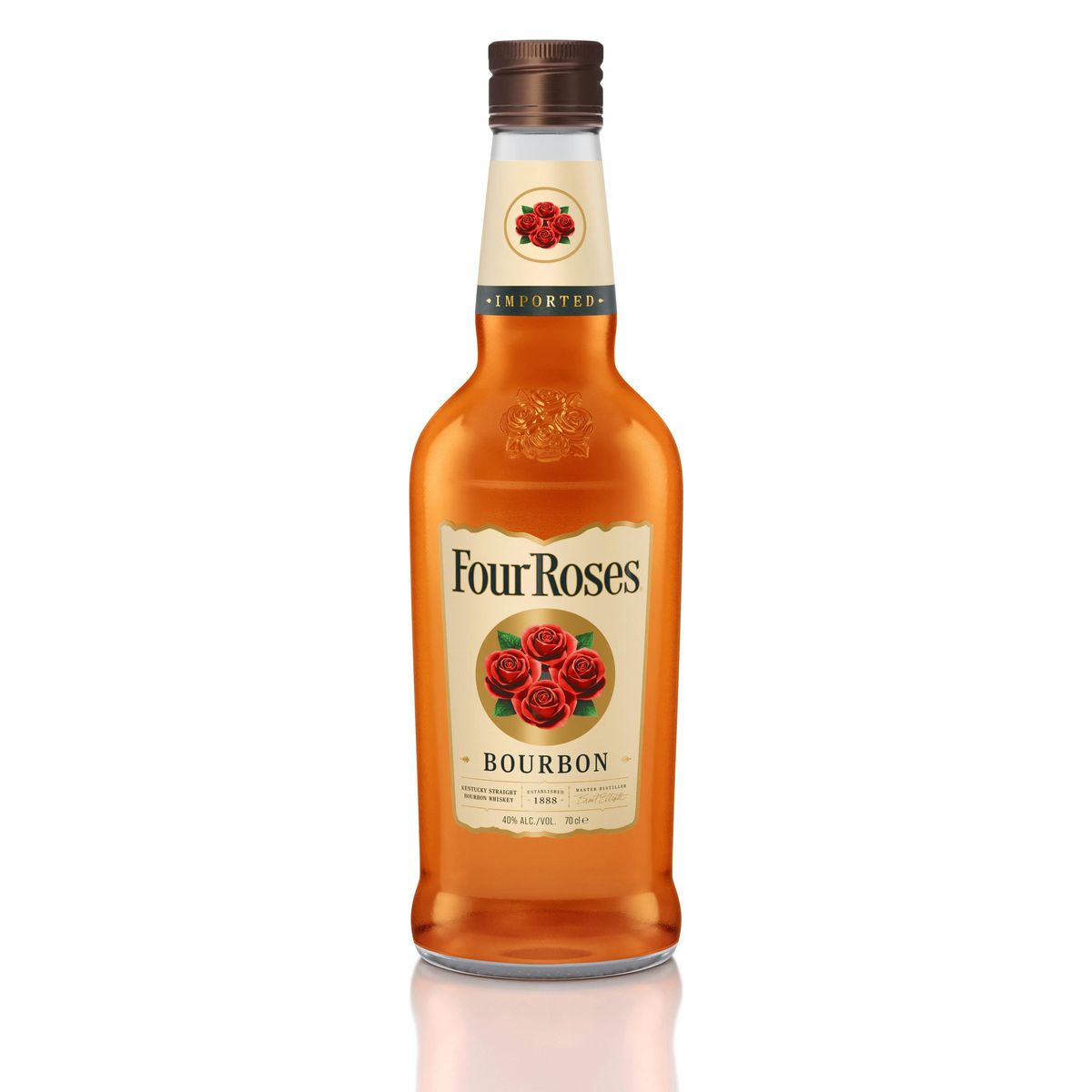 Cet authentique Bourbon du Kentucky est vieilli pendant 5 ans dans des fûts de chêne blanc neufs charbonnés. Année après année, Jim Routledge, le Maître Distillateur, a pu recréer lors de l'assemblage le goût constant de Four Roses, composé de la totalité des 10 recettes de la maison.