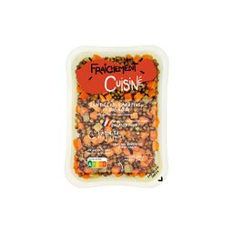 Ingrédients : Lentilles vertes 44%, carottes 21%, oignons 4%, sel, arôme naturel. Traces possibles de BLE.