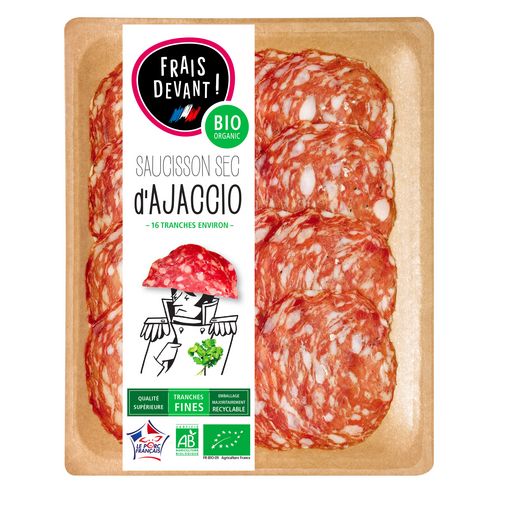 Le saucisson d’Ajaccio est un saucisson de forme Rosette, issu de porc français BIO avec un gros hachage pour respecter les viandes, un salage léger et une fermentation naturelle.