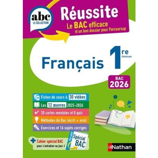 Des fiches de cours , 30 vidéos , les 12 oeuvres du Bac 2026, 20 cartes mentales, des méthodes pour le Bac (écrit et oral), des exercices et 16 sujets corrigés + un cahier spécial Bac pour réviser le français en 1re ! ABC Réussite - Français 1re - Bac 2026 Le BAC efficace pour réussir l'épreuve finale ! - Des fiches de cours et de grammaire pour réviser les notons et les oeuvres du programme. - Des pages révisions express avec des cartes mentales pour retenir en un coup d'oeil. - Des quiz pour se tester, des exercices et des sujets de bac avec leurs corrigés guidés pour s'entraîner. - Des méthodes efficaces pour acquérir les bons réflexes. - Des rubriques d'aide : Gagnez des points , L'astuce du prof ... + 30 vidéos pour réviser autrement + Un cahier spécial BAC : description de l'épreuve, sujets corrigés