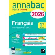 Pour réussir l'épreuve anticipée de Français du bac technologique 2026 ! 44 sujets corrigés conformes au nouveau bac de français : les sujets tombés en 2025 et des sujets complémentaires pour couvrir tout le programme d'oeuvres du bac 2026 en 1re technologique. Des sujets corrigés pour préparer le bac de Français 2026 - Une sélection de commentaires couvrant les différentes périodes de l'histoire littéraire. - Des sujets de contraction & essai sur les oeuvres de littérature d'idées au programme (Discours de la servitude volontaire, Entretiens sur la pluralité des mondes, Lettres d'une Péruvienne). - Des simulations d'oral (explication de texte, question de grammaire et entretien), pour chacune des 12 oeuvres au programme en 1re technologique. Un accompagnement efficace - Au début de l'ouvrage, des sujets traités étape par étape, pour s'approprier la méthodologie des épreuves. - Puis deux types de corrigés : - guidés , pour comprendre comment faire une bonne copie, - flash , pour réviser efficacement dans la dernière ligne droite. En complément : un mémo sur les oeuvres au programme. En plus, avec l'achat de l'ouvrage, un abonnement gratuit au site de révision http : //www. annabac. com (Lien -> http : //www. annabac. com/) : fiches et vidéos de cours, quiz, sujets corrigés...