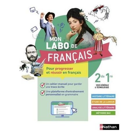 Une offre bi-média avec un cahier-manuel et une plateforme numérique pour progresser en français et réussir les épreuves du Bac. LE CAHIER-MANUEL 14 fiches d'histoire littéraire pour identifier et analyser les mouvements littéraires 14 fiches d'étude de la langue pour renforcer l'expression écrite et orale 27 fiches d'outils d'analyse pour pouvoir analyser tous les types de textes 33 fiches pour se préparer, pas à pas, aux épreuves écrites et orales du Bac Et aussi... De très nombreux extraits d'oeuvres et des exercices Des rabats intelligents avec une frise chronologique LA PLATEFORME Mon labo de français En plus du cahier, + de 300 exercices complémentaires personnalisés et de nombreuses ressources en ligne, organisés en 2 modules, pour aider vos élèves à progresser en autonomie : Le module Révisions : des tests orientant l'élève vers des rappels de cours et des séries d'exercices. Le module Grammaire de lycée : des leçons synthétiques, des exercices progressifs, en fonction des résultats de l'élève. Ces exercices contiennent des extraits des oeuvres imposées en 1re. Et aussi... Des cartes mentales, des liens vers des vidéos ... Des exemples corrigés et commentés de sujets de dissertation sur oeuvre et d'explications linéaires