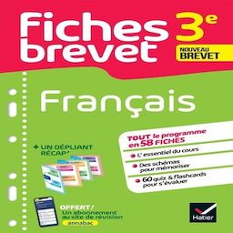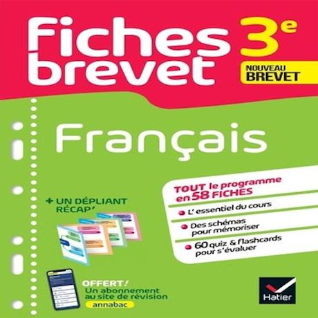 En 58 fiches, l'essentiel du programme de français 3e. Un outil de révision efficace pour réussir ses contrôles et l'épreuve du brevet. 58 fiches détachables, claires et visuelles - Les points clés du cours - Les méthodes utiles pour le brevet - Des quiz pour s'évaluer - Des flashcards pour réactiver ses connaissances Dans le dépliant Des schémas et des cartes mentales pour mémoriser les notions clés Avec le livre, un accès gratuit aux ressources de 3e du site www. annabac. com (Lien -> http : //www. annabac. com/) - fiches, quiz exercices et sujets corrigés... -, à ses parcours de révision personnalisés et à sa rubrique d'orientation.