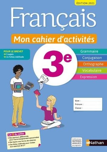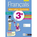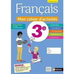 Mon cahier d'activités 3e : un cahier de français pour apprendre plus facilement et pour mieux écrire, lire et parler. Un outil spécifiquement pensé et adapté aux élèves de 3e avec : > Des fiches Accompagnement personnalisé , avec des parcours différenciés > Un bloc Méthode Brevet enrichi avec 11 fiches et 5 sujets pour s'entraîner à l'épreuve > Un bloc Vers la alte de Seconde , avec des tests auto-évaluatifs , des fiches pour s'initier aux exercices de 2de Une organisation claire et efficace avec des parties grammaire, conjugaison, orthographe, vocabulaire et expression : > Des leçons visuelles , sous formes de schémas , pour comprendre en un coup d'oeil > Des parcours différenciés pour respecter le rythme de chacun > Des fiches de révision avec de grands schémas pour récapituler les acquis > Des fiches méthode pour apprendre à apprendre > Une rubrique Vers d'autres langues pour une ouverture sur d'autres cultures > Un outil idéal pour valider les compétences et pour travailler en autonomie + avec l'appli Nathan live ! : des dictées et des textes lus en accès direct en scannant la couverture du cahier