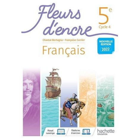 Vous retrouverez dans votre manuel de Français Fleurs d'encre : Un choix de textes entièrement renouvelé, avec un équilibre entre textes altiques et contemporains, une iconographie riche et des activités différenciées. Des parcours de lecture d'oeuvres intégrales. Une démarche novatrice d'apprentissage du lexique et de l'orthographe. Des ressources numériques variées. Une plateforme d'exercices de langue offerte pour toute adoption d'un des manuels. En 6e : des projets de alte innovants et fédérateurs. En 5e : tous les textes et toutes les dictées enregistrés et à écouter. En 3e : une préparation au Brevet dans chaque chapitre.