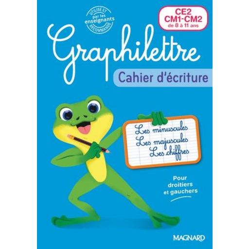 Des activités variées et ludiques pour s'entraîner et progresser CE2-CM1-CM2 (de 8 à 11 ans) - Ce cahier d'écriture propose à l'enfant de s'entraîner au tracé des lettres minuscules et majuscules cursives ainsi que des chiffres. - Des pages de révision ponctuent les différentes étapes de l'apprentissage. - Des pages de récréation permettent à l'enfant de se perfectionner en s'amusant. - En fin d'ouvrage, une réglette avec les modèles d'écriture à découper. Pour droitiers et gauchers Utilisé et recommandé par les enseignants