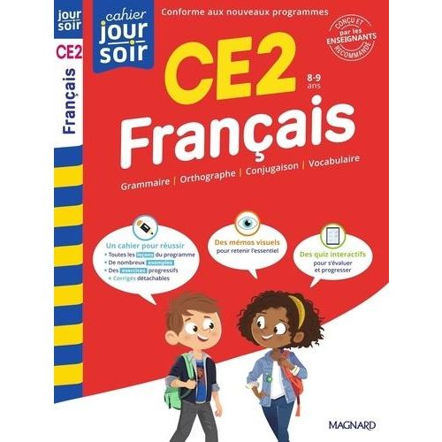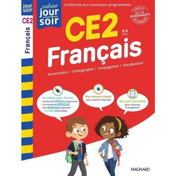 Pour revoir tout le programme et progresser en français Tout le programme de français CE2 pour réviser et progresser ! Cahier Jour Soir : une collection conçue et recommandée par les enseignants. - Une structure simple et claire pour progresser en français : - Les leçons pour réviser tout le programme : grammaire, orthographe, conjugaison, vocabulaire - Toutes les règles et de nombreux exemples pour bien comprendre - Des exercices progressifs pour s'entraîner tout au long de l'année - Le + accessible par un QR code : - des mémos visuels : des schémas et cartes mentales avec l'essentiel à retenir, pour une mémorisation visuelle efficace - des quiz numériques interactifs, sur toutes les notions du programme, pour s'évaluer et progresser de manière ludique - Le + pour les parents : un cahier central détachable avec tous les corrigés.