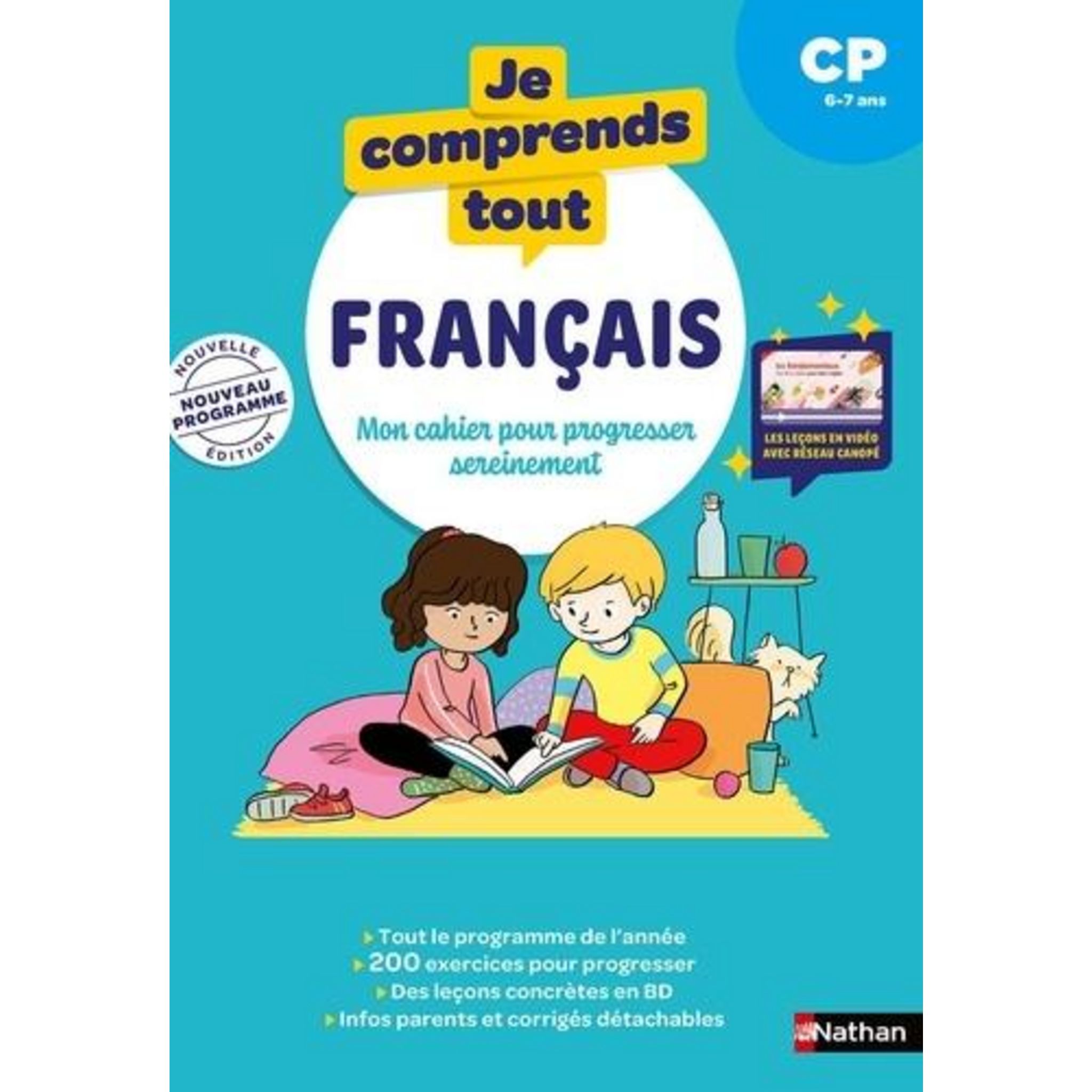 La méthode complète et ludique pour maîtriser tout le programme de français CP - Lecture, écriture, grammaire, conjugaison, orthographe et vocabulaire ! Un cahier innovant qui combine exercices, BD et vidéos pour un apprentissage serein et efficace. Accompagnez votre enfant vers la réussite en CP avec ce cahier d'exercices complet et structuré : - 200 exercices progressifs couvrant tout le programme : lecture, écriture, grammaire, conjugaison, orthographe et vocabulaire - Des leçons expliquées en BD pour rendre l'apprentissage concret et motivant - Des vidéos des leçons accessibles via QR codes proposées par le Réseau Canopé - Les corrigés détachables de tous les exercices - Tableau des sons et alphabet inclus - Guide parents avec explications sur le programme scolaire et les méthodes d'apprentissage. Conçu par une équipe d'enseignants spécialement pour le travail à la maison !