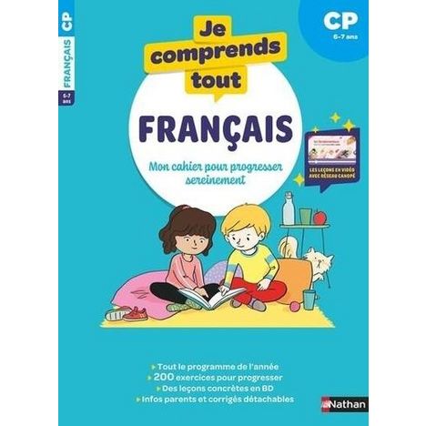 Un cahier de soutien motivant pour réviser le français tout au long de l'année de CP ! Un cahier conçu pour progresser sereinement à la maison, avec les leçons en vidéo de Réseau Canopé, la référence des enseignants. Une entrée ludique dans la leçon avec une petite BD humoristique Un mémo qui rappelle l'essentiel de la leçon 200 exercices progressifs (avec les corrigés détachables) Un cahier de leçons détaillées pour les parents et les enfants Les leçons en vidéo pour un apprentissage complémentaire, ludique et motivant Un cahier complet avec les exercices et les leçons pour revoir tout le programme de Français du CP en lecture / écriture, grammaire, conjugaison, orthographe, vocabulaire. Avec les vidéos de Réseau Canopé : > Toutes les vidéos proposées dans ce cahier sont accessibles facilement avec un QR code à chaque leçon. > Elles sont issue de la plateforme Les fondamentaux , ce sont des films d'animation très qualitatifs souvent utilisés par les enseignants en alte, qui permenttent d'apprendre de façon ludique les notions fondamentales de l'école élémentaire en Français et en Maths.