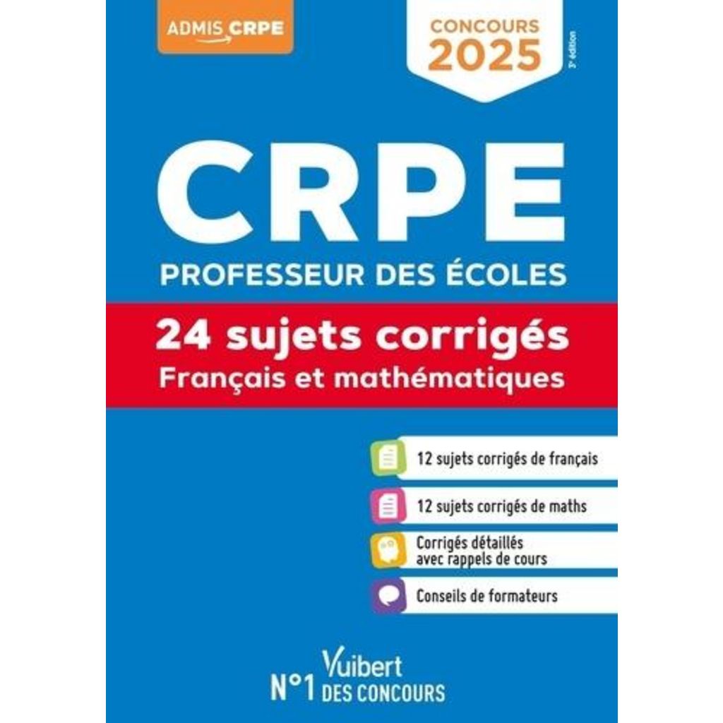 En savoir +Le livre indispensable d'entraînement intensif pour réussir les épreuves écrites de français et de maths du CRPE 2025 (M2) ! Mettez toutes les chances de votre côté et performez aux épreuves écrites d'application de français et de mathématiques du concours de professeur des écoles, grâce à : une méthodologie de chaque épreuve assortie de conseils de formateurs , 12 sujets de français, dont les annales 2024 , 12 sujets de mathématiques, dont les annales 2024 , des corrigés détaillés et commentés comportant des rappels de cours.