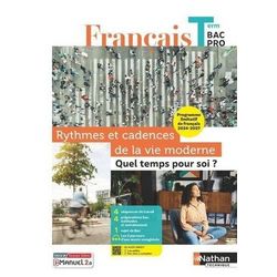 Ce cahier clair et concis met à la portée de tous les profils d'élèves le thème du programme limitatif de Français en Terminale Bac Pro pour les sessions 2025 à 2027 : Rythmes et cadences de la vie moderne : quel temps pour soi ? . Il est proposé au choix en livre papier + licence numérique i-Manuel ou en 100% numérique i-Manuel. En version imprimée, cet ouvrage propose en complément une licence numérique i-Manuel 2. 0, la solution pour mettre les élèves en activité sur ordinateur ou sur tablette. En cas de prescription à l'ensemble de la alte (20 élèves minimum), l'activation de la licence élève est laissée au libre choix de l'enseignant. A utiliser seul ou en complément de tout manuel, ce cahier d'activités pour la alte permet de traiter le thème en vigueur et de préparer les élèves à l'examen. Il a été conçu pour susciter la curiosité et l'intérêt des élèves, et pour contribuer à leur donner le goût de la lecture, tout en prenant en compte le calendrier des épreuves de Français qui ont lieu en mai. Riche d'une grande variété de supports, il propose, à travers une maquette invitante : une introduction au thème , Deux groupements de textes , avec des activités et des questionnaires progressifs pour s'approprier les problématiques soulevées par le thème , un parcours sur Courir de Jean Echenoz et un parcours sur Le Parfum des fleurs la nuit de Leïla Slimani qui permettent de travailler le texte original et ses passages clés, tout en offrant la contextualisation nécessaire , des textes enregistrés à écouter seul ou en alte, accessibles par QR Code , des activités d'expression variées centrées autour de l'enrichissement du lexique et de l'amélioration de l'expression écrite et orale , des questionnaires guidés autour des compétences, et des bilans personnels pour accompagner au mieux la progression des élèves , un entraînement complet au Bac avec des méthodes et leurs applications, et un sujet complet . Le cahier pourra également servir lors du parcours de préparation à la poursuite d'études en BTS , la réforme actuelle rapprochant sensiblement les épreuves écrites du BTS de celles du Bac Pro. Le support numérique i-Manuel répond par ailleurs aux besoins des élèves en alte et à la maison, et est adapté aux dys .
