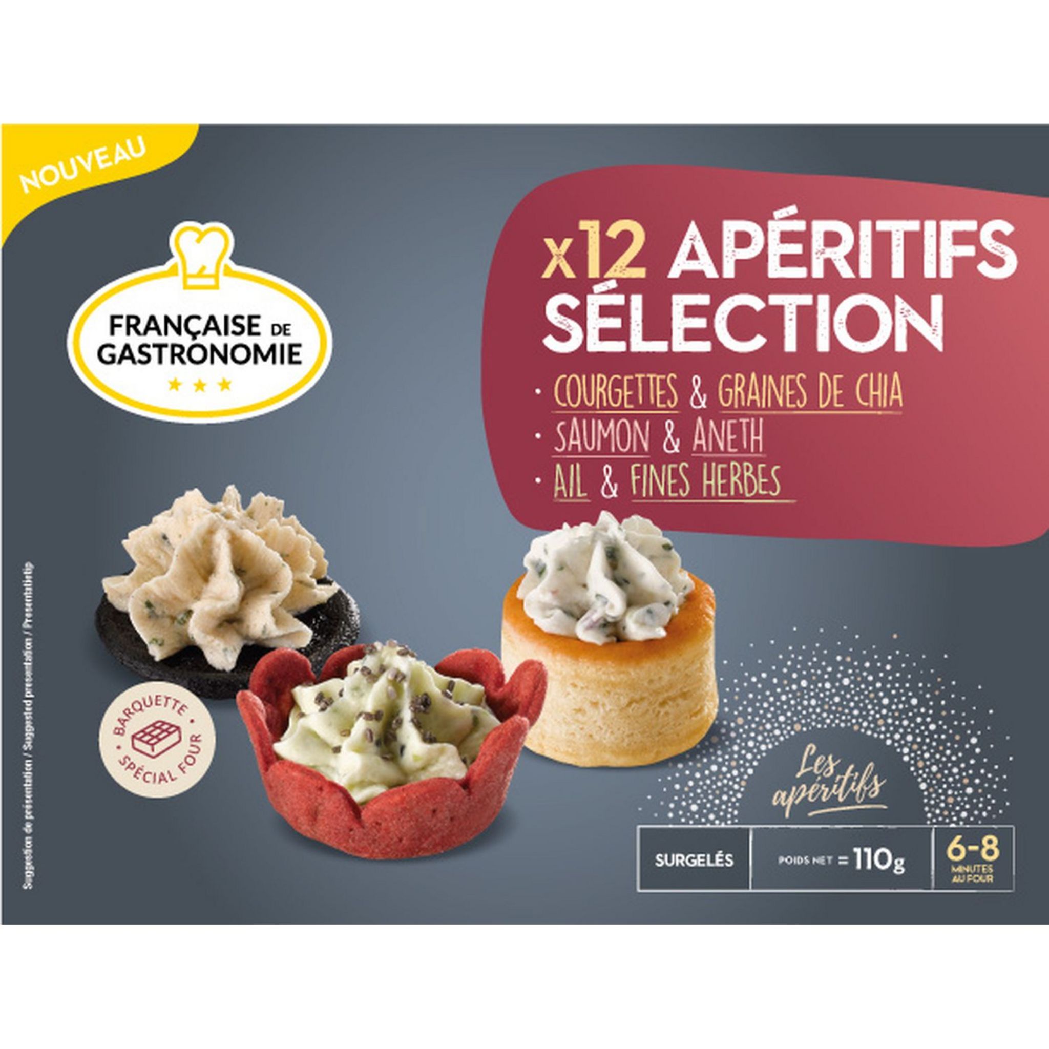 12 Mini bouchées apéritives surgelées : 4 tartelettes garnies d’une préparation à la courgette et graines de chia, 4 blinis garnis d’une préparation avec du saumon et de l’aneth, 4 feuilletés garnis d’une préparation au fromage et fines herbes.