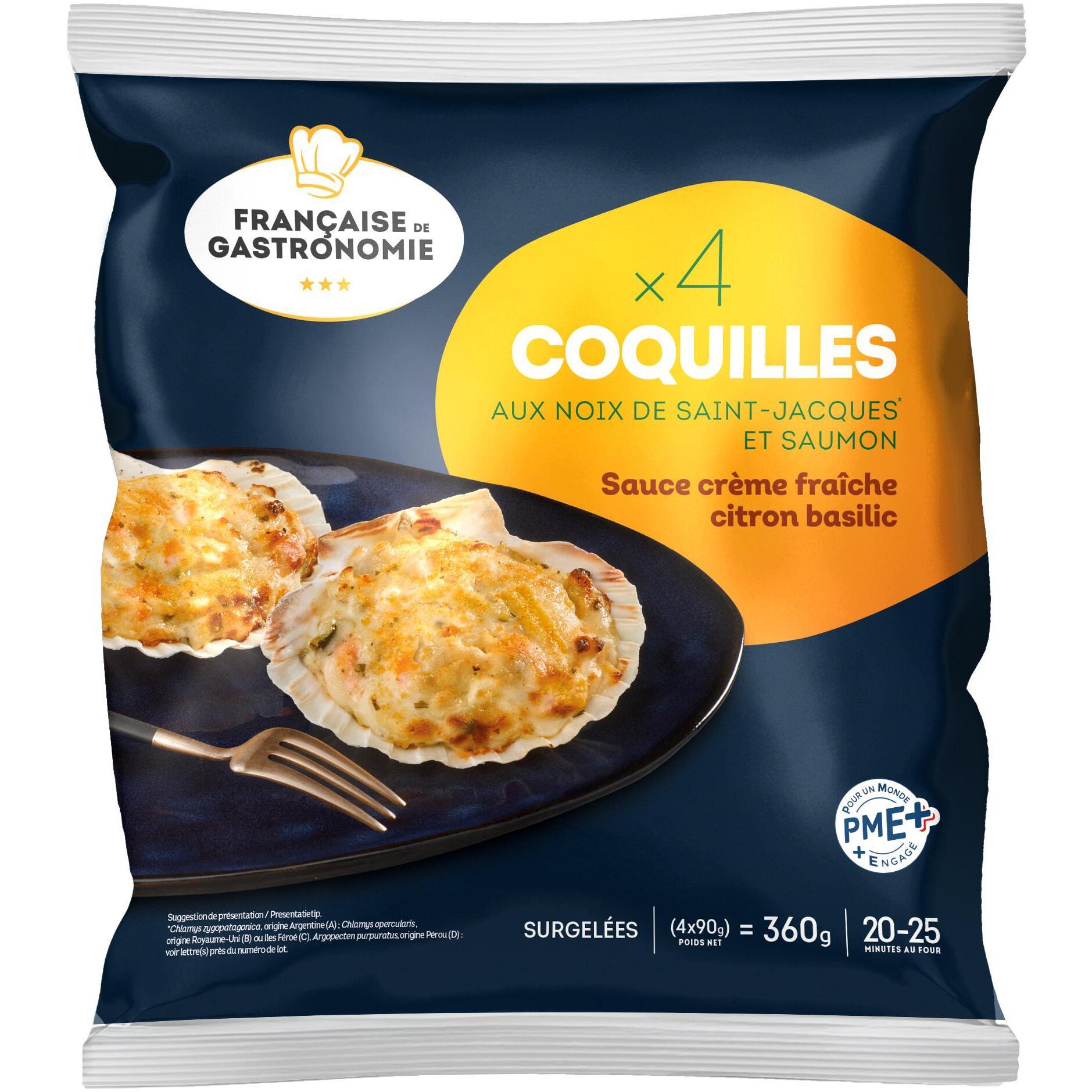 Ingrédients : Eau, Noix de Saint Jacques* 15,6% (*Chlamys Zygopatagonica, origine Argentine et/ou Chlamys opercularis, origine Féroé), Saumon Atlantique 15,2% (Salmo salar), crème fraîche épaisse 13,8%, vin blanc (contient sulfites), échalotes, courgettes, carottes jaunes, beurre, farine de blé, poudre de lait écrémé, amidon modifié de maïs, chapelure 1,1% (chapelure, orange déshydratée 0,06%, poudre de jus concentré de citron 0,05%, carotte déshydratée, épices, citron déshydraté 0,01%, plantes aromatiques), jus de citron concentré 0,8%, sel, vinaigre d’alcool, basilic 0,4%, poivre.