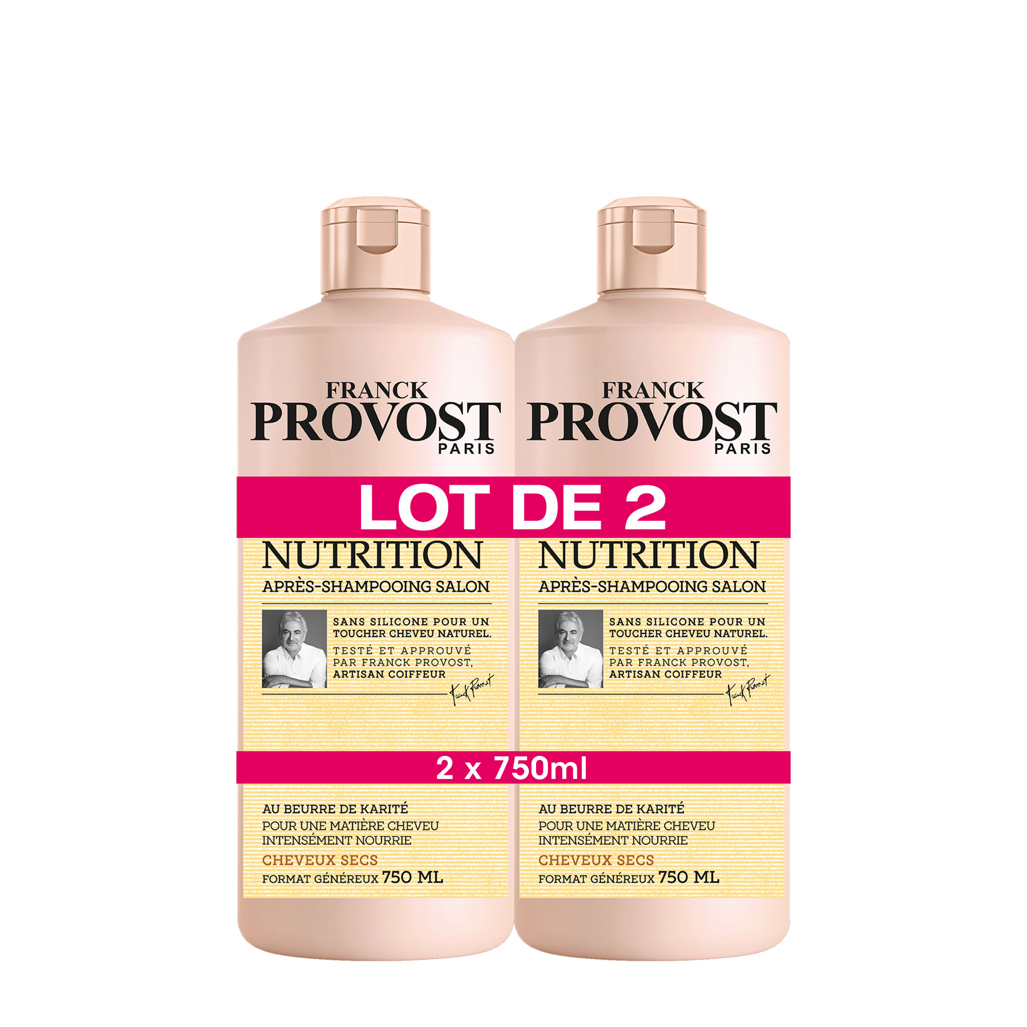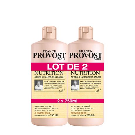 Franck Provost après-shampooing expert nutrition 2x750ml Après-shampooing professionnel au beurre de karité pour les cheveux secs, rêches. Enrichi en beurre de karité, mon après shampooing démêle, nourrit et assouplit la chevelure pour la rendre souple et soyeuse.