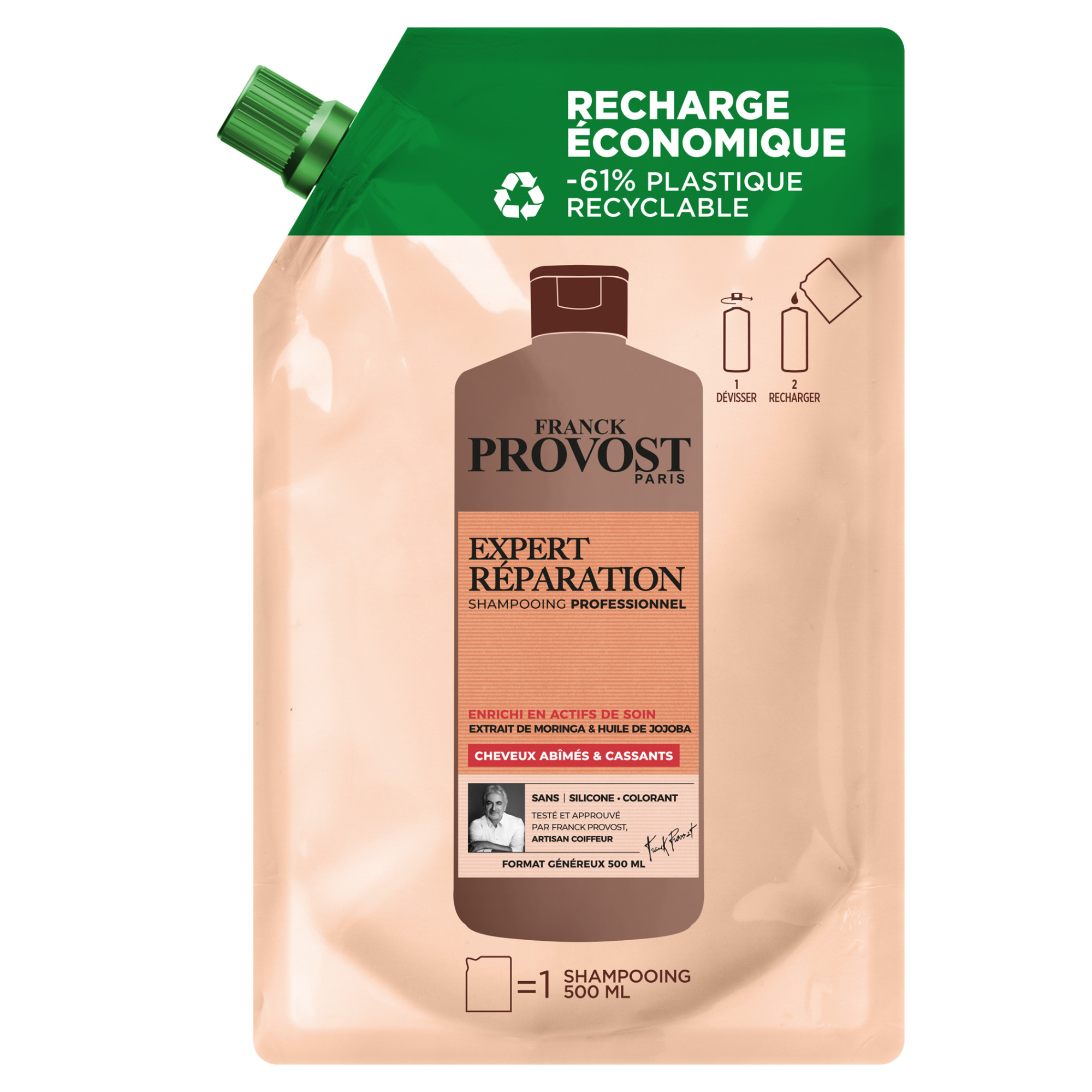 Éco Recharge Shampooing professionnel pour les cheveux abîmés, cassants et fourchus. des cheveux renforcés de la racine jusqu'aux pointes. L’expertise professionnelle Franck Provost c’est savoir apporter tout le soin dont vos cheveux ont besoin sans les surcharger. Au coeur de toutes nos formules, un complexe de soin sans silicone qui cible uniquement les zones abîmées du cheveu pour les traiter sans les alourdir. C’est ce qui garantit la signature Franck Provost : une matière cheveu pure, sans surcharge et au toucher naturel.