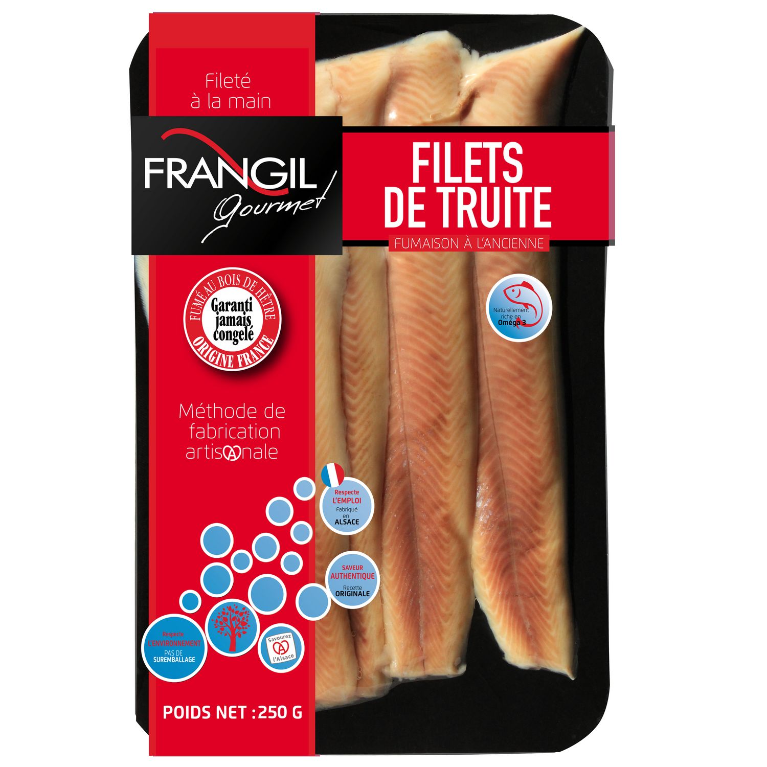 Ingrédients : filets de TRUITE (oncorhynchus mykiss) élevée en eaux douces en france, sel