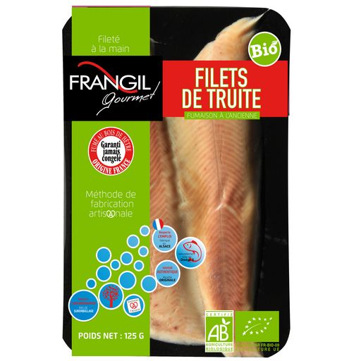Ingrédients : Filets de TRUITE issue de l'agriculture biologique (Oncorhynchus mykiss) élevée en eaux douces en France, sel