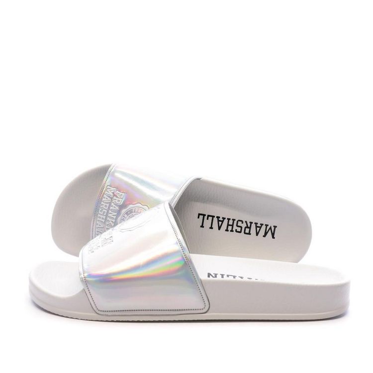 Découvrez ces claquettes Femme de la marque Franklin & Marshall ! Couleur : Argent Bride synthétique Inscription et logo Franklin & Marshall Semelle extérieure synthétique