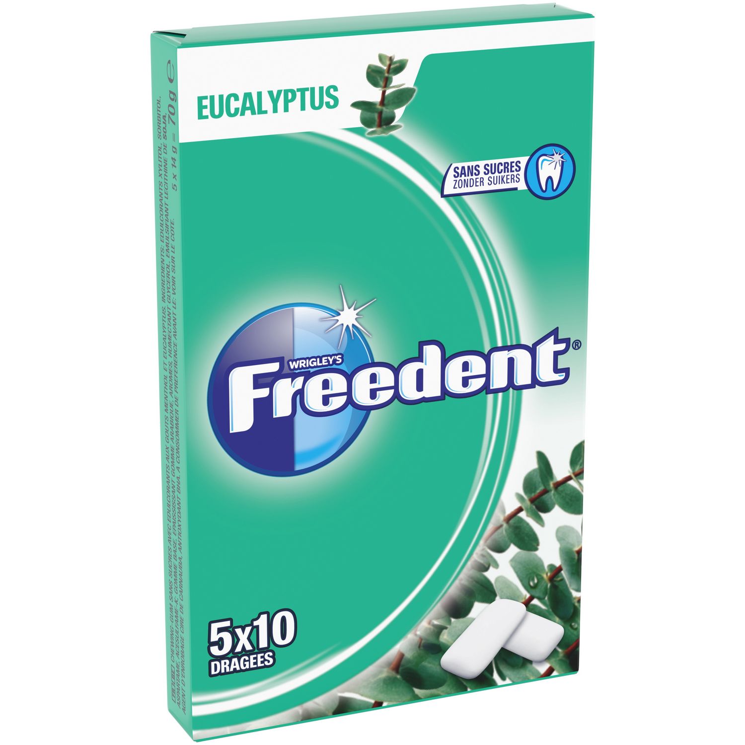 CHEWING-GUM SANS SUCRES AVEC EDULCORANTS AUX GOUTS MENTHOL ET EUCALYPTUS.