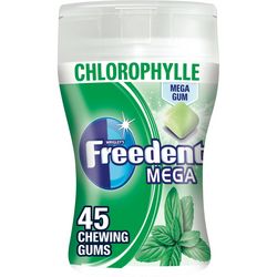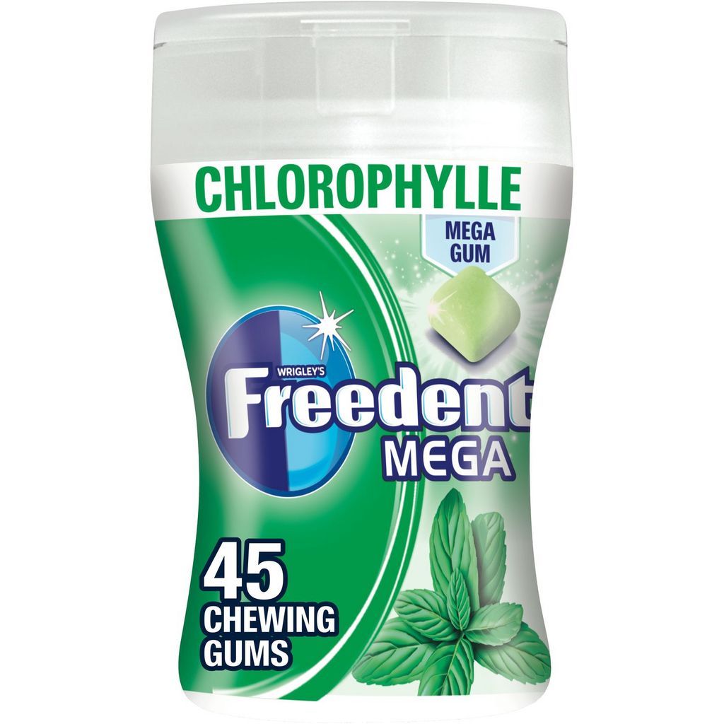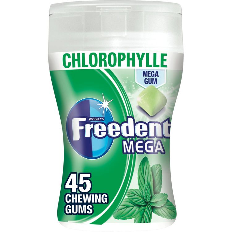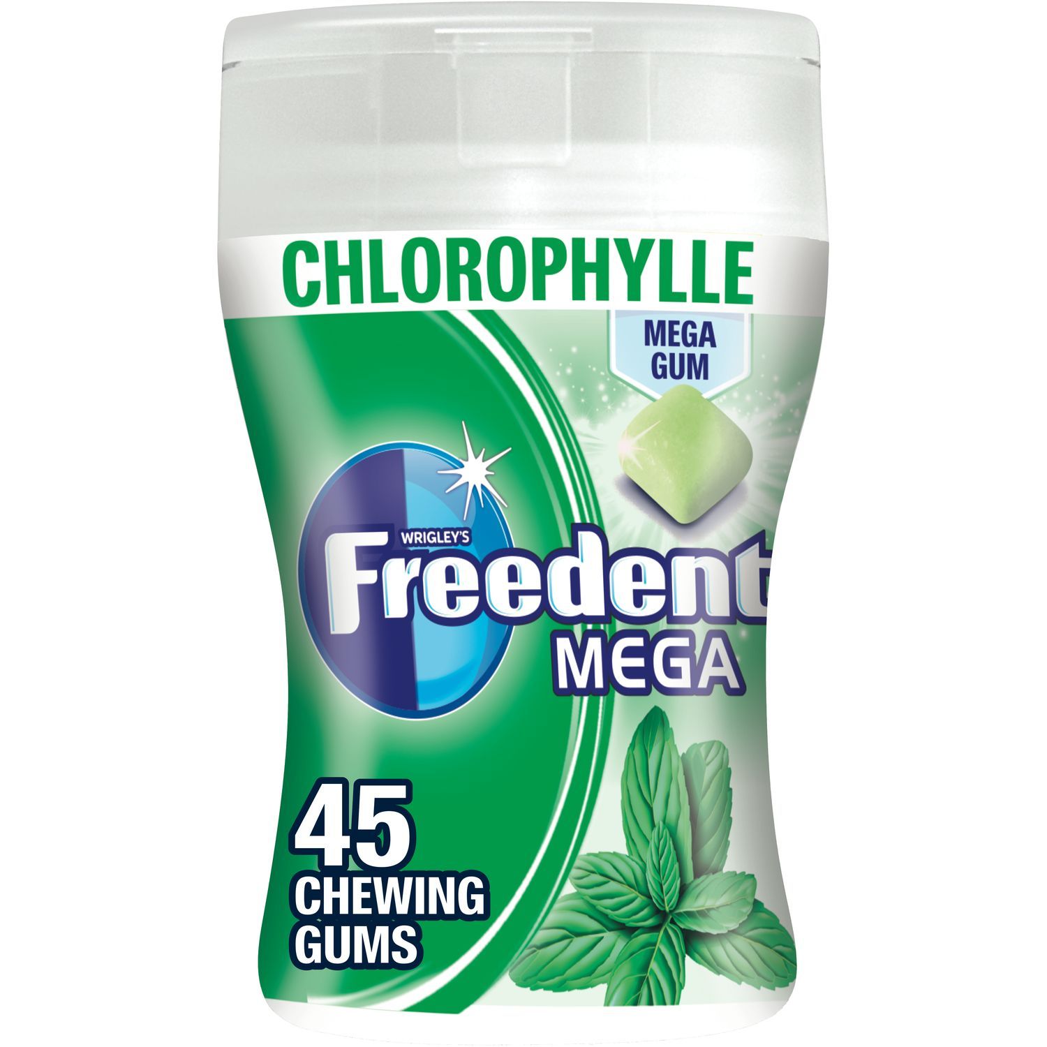 Freedent Mega Chlorophylle 45 chewing-gums Un chewing-gum au parfum chlorophylle, moelleux et gourmand, pour une haleine fraîche et des dents propres et saines.