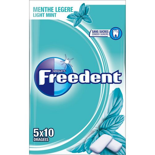 Chewing-gum sans sucres avec édulcorants au gout menthe. Freedent Menthe Légère 5x10 Dragées
