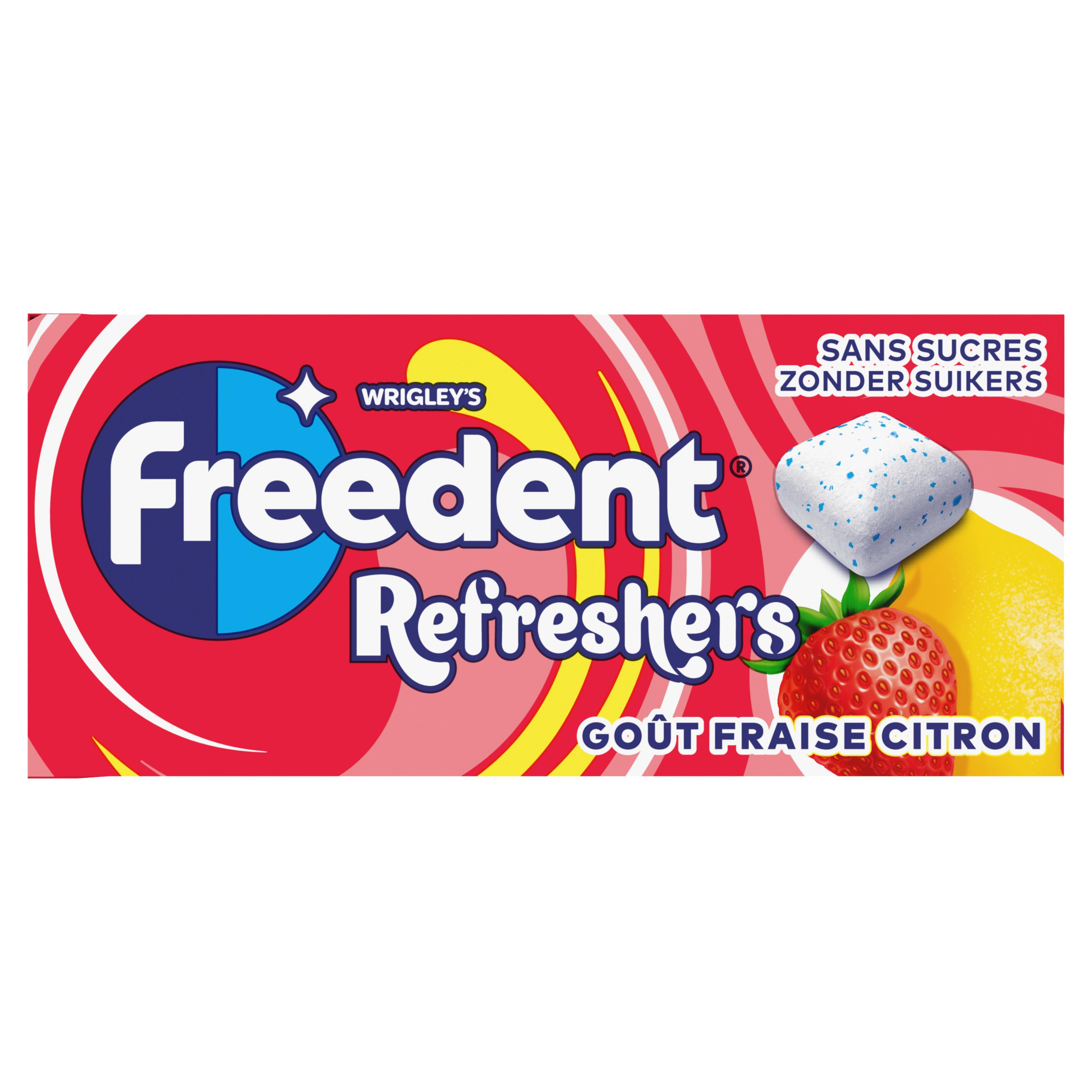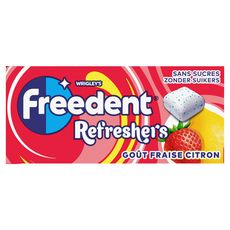 Freedent® Refresher Chewing-gum à mâcher sans sucres au bon goût de Fraise et de Citron qui aide à éliminer les tâches et maintenir la blancheur naturelle des dents. Les chewing-gums sans sucres Freedent® sont bénéfiques pour la santé dentaire car ils aident à neutraliser les acides de la plaque dentaire. Ils sont approuvés par l'Union Française pour la Santé Bucco Dentaire (UFSBD)