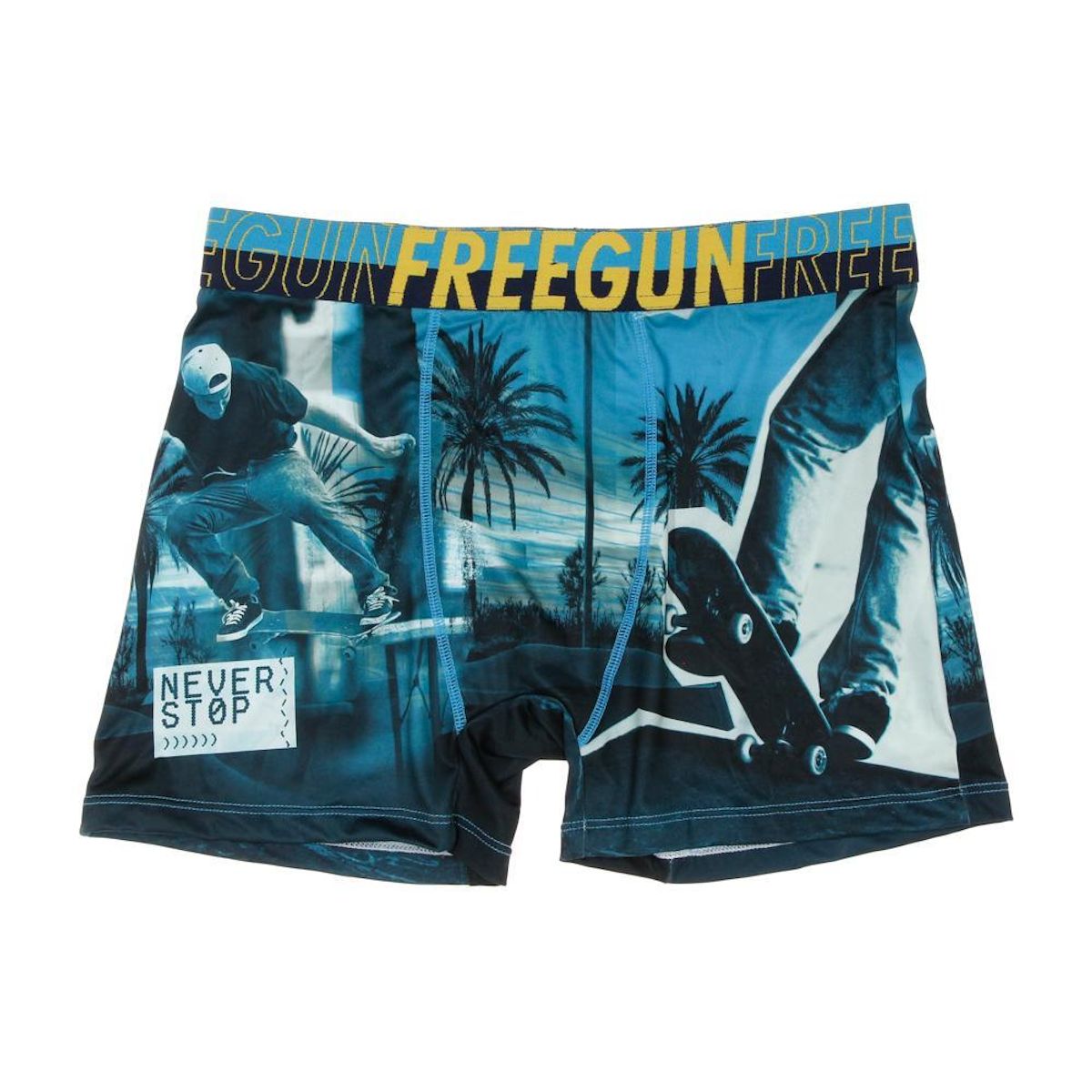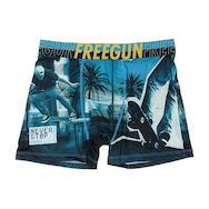 Craquez pour ce boxer de la marque Freegun !Coloris : Noir/BleuTaille élastiqueComposition : 92% polyester, 8% élasthanneInscription Freegun sur la ceintureCoupe altiqueMotifs imprimés