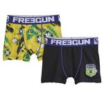 Des boxers Freegun, 100% foot, équipe du Brésil, hyper confortables : les garçons adorent ! Ils sont réalisés en microfibre douce et légère. Taille élastiquée. Imprimé fantaisie. Coutures renforcées. Doublure 100% coton. Ce lot de 2 boxers Freegun pour garçon est lavable en machine à 30°.