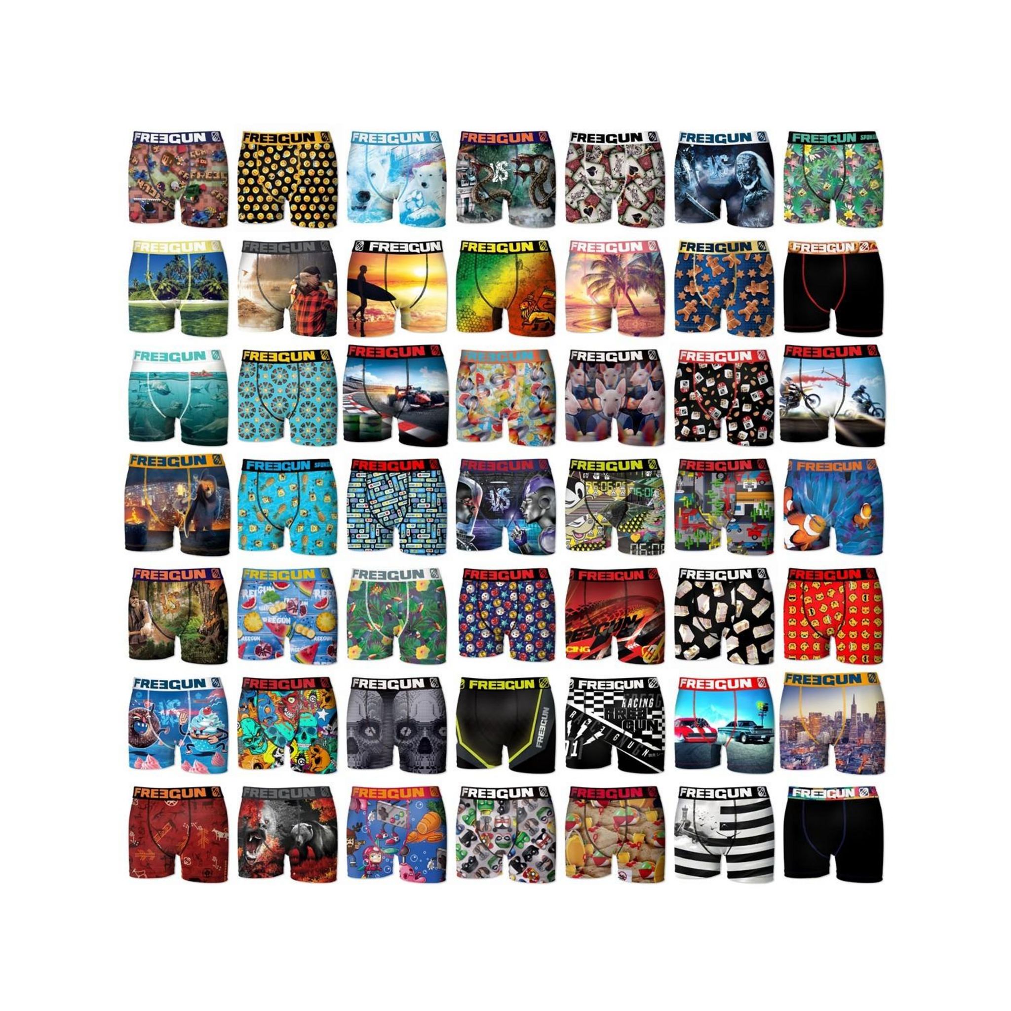 Si tu adores les surprises, ce pack est fait pour toi ! Ce pack surprise de 5 boxers est parfait si tu as le goût de l'inconnu ! Dans ce pack se trouve des boxers colorés et confortables. L'élastique des boxers Freegun t'assure d'avoir un boxer qui s'attache bien à ta taille.*Sélection de boxers alé
