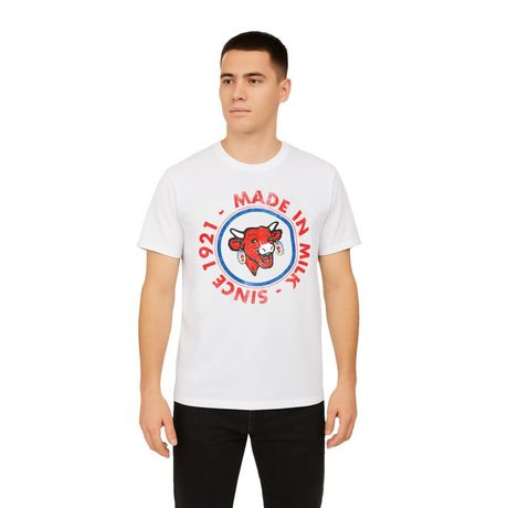 Affichez votre style avec une touche d'ironie 100 % française grâce à ce tee-shirt FREEGUN en collaboration avec La Vache Qui Rit. Sur fond blanc, rouge ou bleu marine, son imprimé Made in Milk Since 1921 rend hommage à une icône culte avec un twist graphique assumé. Sa coupe regular fit et son ef