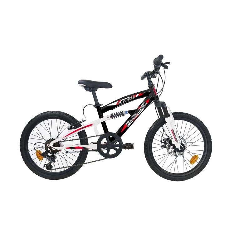 Vélo VTT 20'' Tout Suspendu avec cadre suspendu et fourche télescopique, équipé de 6 vitesses via un dérailleur Shimano arrière TY21 et une poignée tournante, Frein avant à disque mécanique et V-Brake arrière, jantes noires en aluminium 36 rayons avec attache rapide avant, Potence plongeur, sonnette