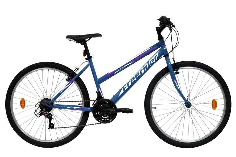 VTT 26 Femme Lulea/Freerider - Cadre acier rigide - Fourche rigide - 18 vitesses par poignées tournantes - Dérailleur arrière indexé - Potence plongeur - Freins avant et arrière V-brake avec étriers acier & Leviers en résine noire - Jantes aluminium avec attache rapide avant & pneus noirs - Blocage rapide tige de selle - Sonnette - Eclairage à piles fournies