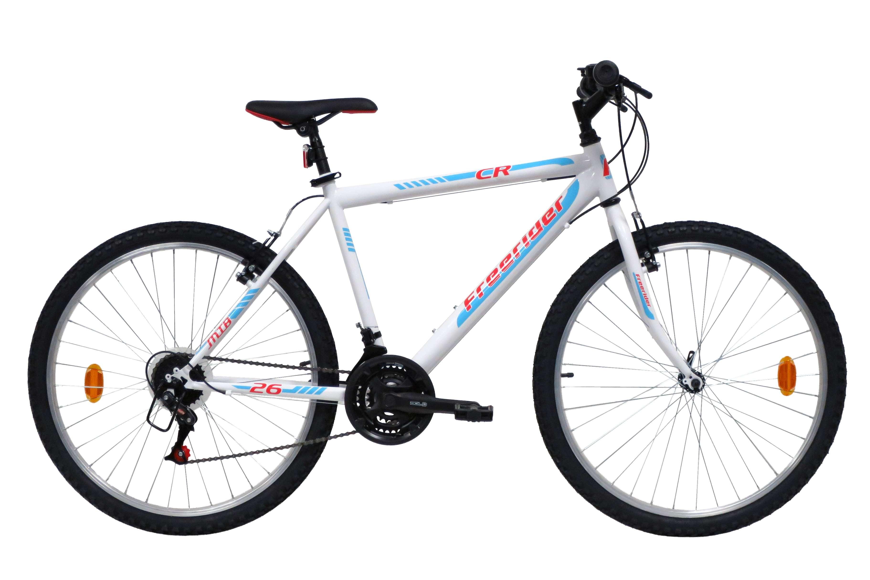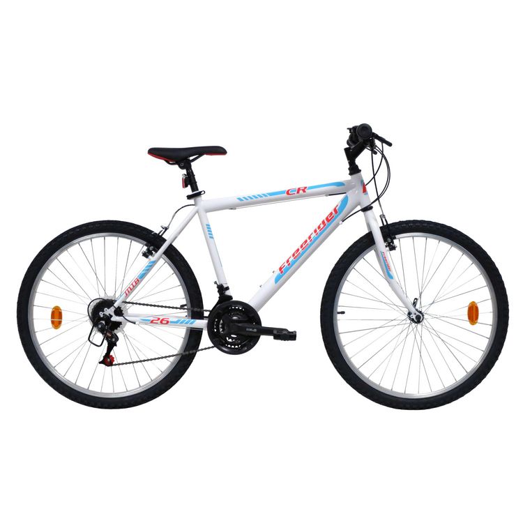 VTT 26 Rigide Homme CR/Freerider - Cadre acier - Fourche rigide - 18 vitesses indexées par poignées tournantes - Dérailleur arrière indexé - Potence plongeur - Freins avant et arrière V BRAKE avec étriers acier & Leviers en résine noire - Jantes aluminium avec attache rapide avant & pneus noirs - Blocage rapide tige de selle - Sonnette - Eclairage à piles fournies.
