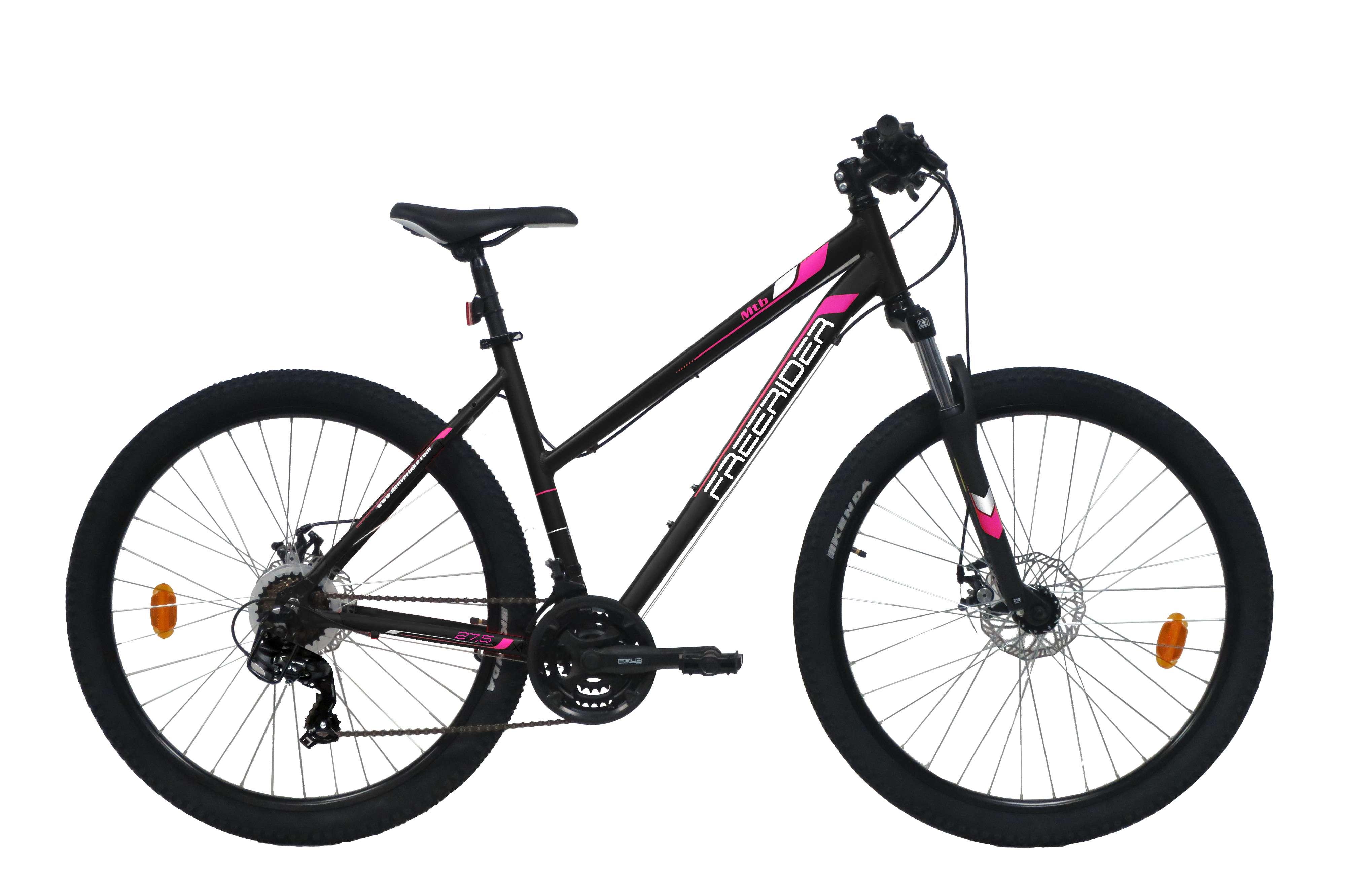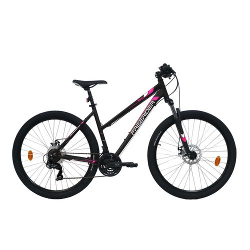 VTT 27,5'' Femme Freerider - Cadre alu rigide - Fourche télescopique - 21 Vitesses par poignées à gâchettes Trigger - Roue libre 7 vitesses Shimano - Dérailleur arrière Shimano TY300 - Potence Headset - Frein avant et arrière à disque - Leviers de freins en aluminium - Jantes aluminium double paro
