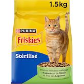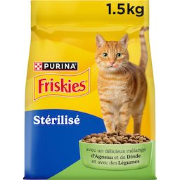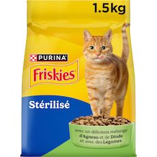 Avec FRISKIES, nous comprenons que vous vous préoccupiez aussi bien de votre animal que de l'environnement. Agissons ensemble avec FRISKIES ! Nutrition de qualité 100% complète et équilibrée adaptée aux besoins de votre chat. Élaboré avec des ingrédients naturels sélectionnés et sans colorants. FRISKIES Stérilisé est recette spécialement formulée pour donner à votre chat stérilisé toute la nutrition dont il a besoin. Ce sont des croquettes avec un délicieux mélange d'Agneau et de Dinde avec des Légumes.