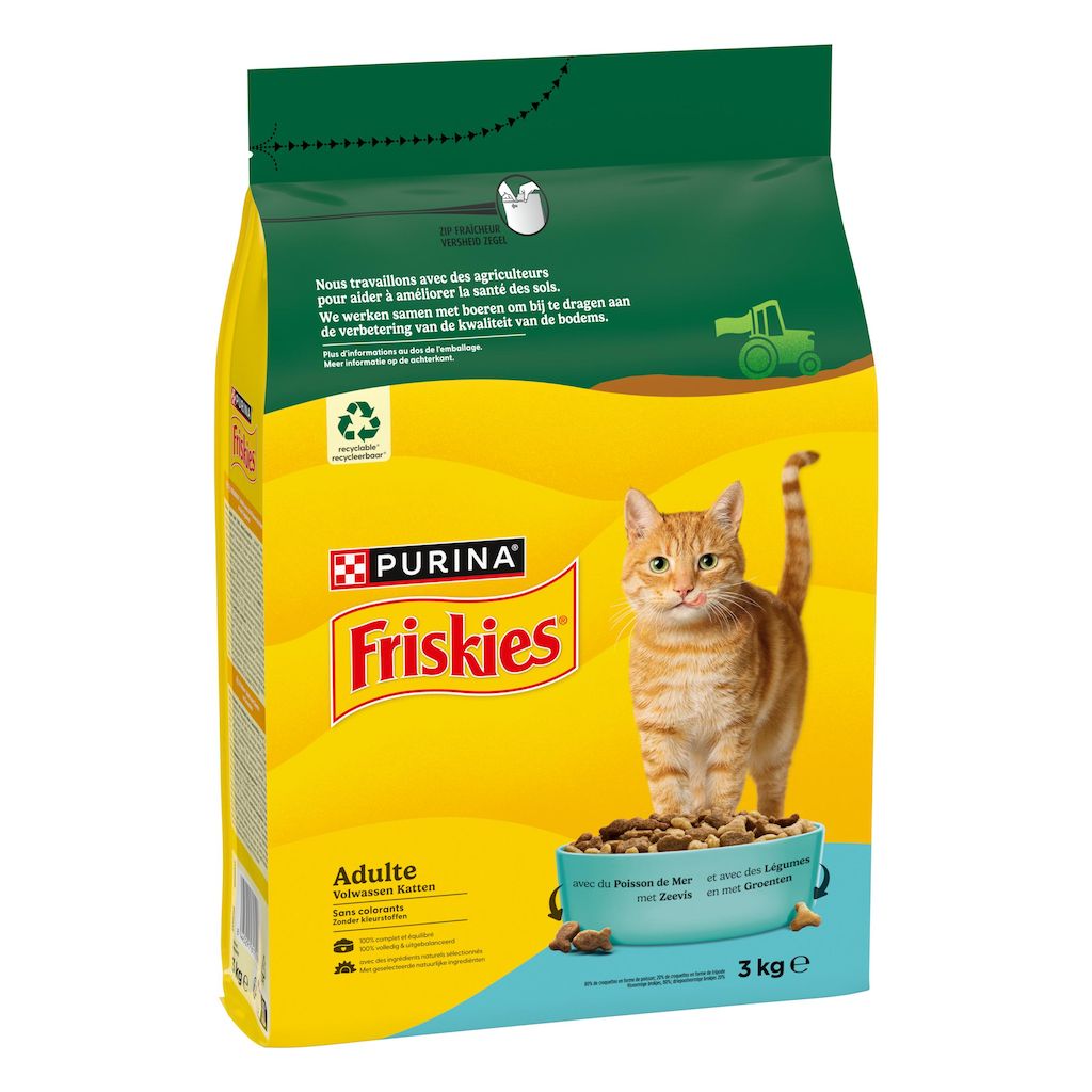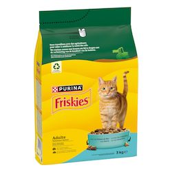 Avec FRISKIES, nous comprenons que vous vous préoccupiez aussi bien de votre animal que de l'environnement. Agissons ensemble avec FRISKIES ! Nutrition de qualité 100% complète et équilibrée adaptée aux besoins de votre chat. Élaboré avec des ingrédients naturels sélectionnés et sans colorants. FRISKIES Adulte donne à votre chat adulte (1 an et +) toute la nutrition dont il a besoin afin de l'aider à rester en bonne santé. Ce sont des croquettes avec du Poisson de Mer et des Légumes.
