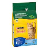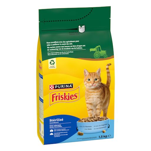 FRISKIES Stérilisé est recette spécialement formulée pour donner à votre chat stérilisée toute la nutrition dont il a besoin. Ce sont des croquettes avec du Saumon et des Légumes. Avec FRISKIES, nous comprenons que vous vous préoccupiez aussi bien de votre animal que de l'environnement. Agissons ensemble avec FRISKIES ! Nutrition de qualité 100% complète et équilibrée adaptée aux besoins de votre chat. Élaboré avec des ingrédients naturels sélectionnés et sans colorants. Composition typique du produit: 80% de croquettes en forme de cube; 20% de croquettes en forme de disque.