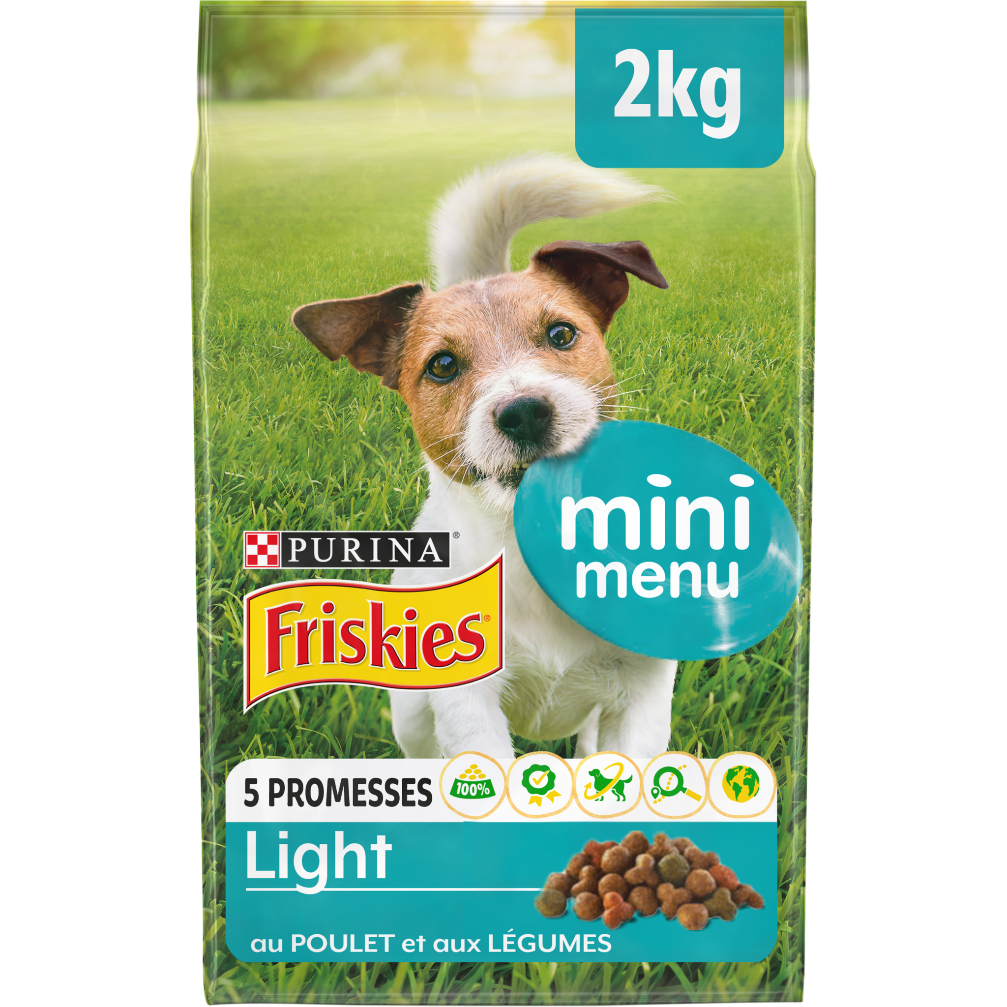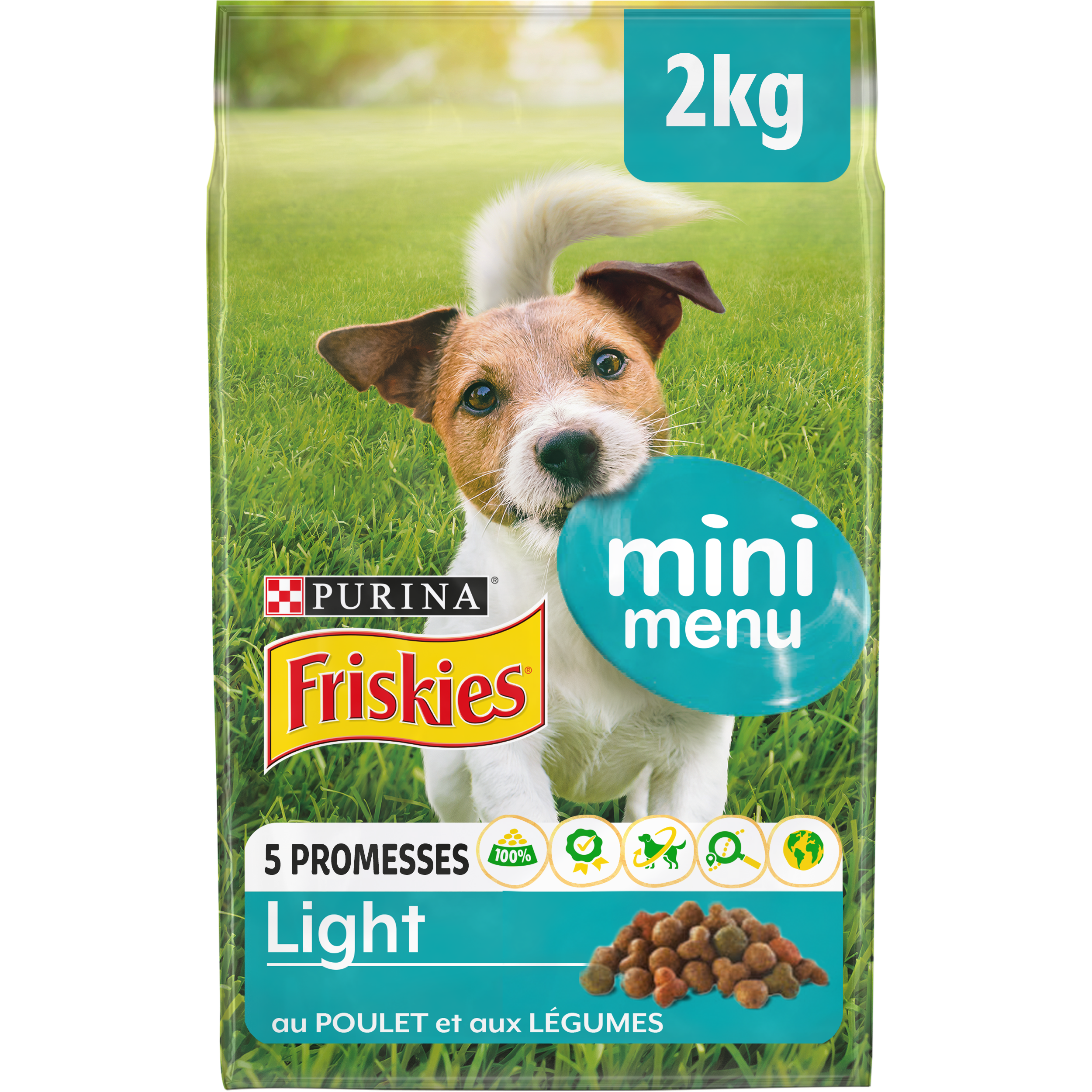Aliment complet pour chien adulte. PURINA® Friskies® Vitafit™ : pour un chien plein de vitalité !Depuis plus de 80 ans, PURINA® Friskies® aide des générations de chiens à rester épanouis et pleins de vitalité. Vous aimez votre petit chien, l'enthousiasme et la joie de vivre qu'il apporte à votre famille. C'est pourquoi vous voulez vous assurer qu'il reste toujours vif, plein d'énergie et de vitalité ! C'est pour cette raison que les vétérinaires et nutritionnistes PURINA® ont développé Friskies® Mini Menu Light, une savoureuse recette au poulet et aux légumes, avec des céréales complètes, des vitamines B et des acides gras Oméga 3 & 6. Développée pour votre chien de petite taille, elle contient des croquettes plus petites. Sa formule allégée en matières grasses vous aide à contrôler le poids de votre chien et procure une alimentation 100 % complète et équilibrée.