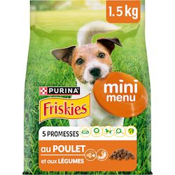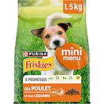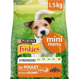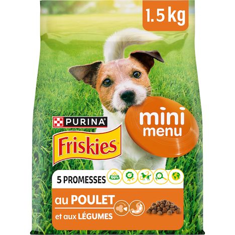 PURINA FRISKIES Mini Menu est une recette savoureuse, spécialement développée pour votre petit chien, avec des croquettes de petite taille. 100% complète et équilibrée, elle est élaborée avec des ingrédients de qualité et des fibres pour une digestion saine Avec FRISKIES, nous comprenons que vous vous préoccupiez aussi bien de votre animal que de l'environnement. Agissons ensemble avec FRISKIES ! Nos recettes sont 100% complètes et équilibrées et adaptées aux besoins de votre chien, elles sont élaborées avec des ingrédients naturels sélectionnés et sont sans colorants.