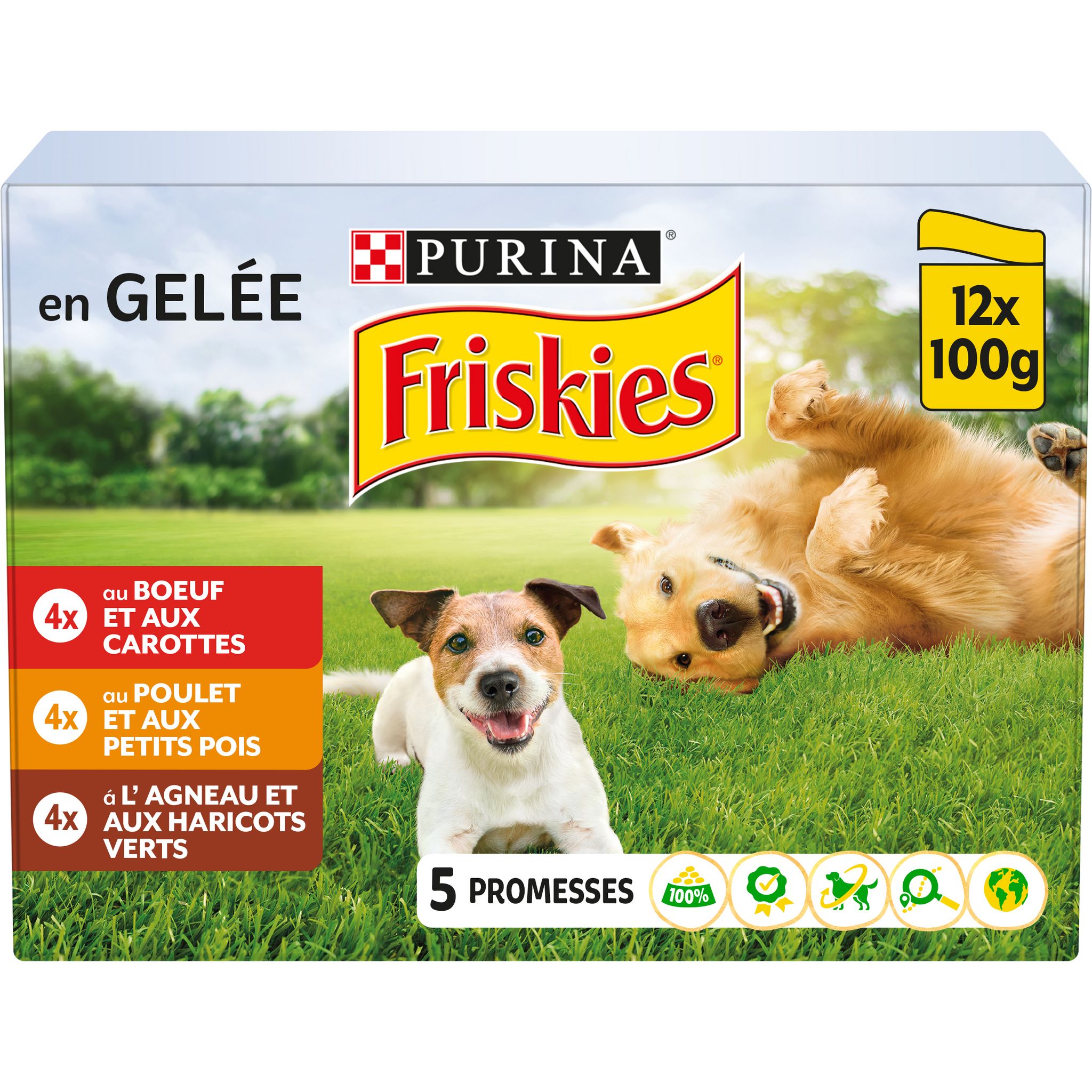 Les 5 Promesses FRISKIES® #Depuis le jour où vous avez accueilli votre chien chez vous, vous avez pris un engagement, fait la promesse de prendre soin de lui, de bien le nourrir. #Chez FRISKIES®, nous avons fait la même promesse. #Depuis plus de 50 ans, FRISKIES® nourrit des générations des de chiens heureux et en bonne santé grâce à une alimentation savoureuse et de qualité. C'est une grande responsabilité. #Tout comme vous, chez FRISKIES® nous tenons nos engagements et 5 promesses nous tiennent à cœur : #1) Nutrition : Une savoureuse recette 100% complète et équilibrée, élaborée avec un mélange de protéines animales et végétales, comme les céréales. #2) Qualité : Des centaines de contrôles quotidiens sont effectués tout au long de notre processus de production. #3) Expertise : Tous nos produits sont développés par les nutritionnistes PURINA. #4) Traçabilité : Nos recettes sont préparées avec des ingrédients de haute qualité, rigoureusement sélectionnés provenant de fournisseurs de confiance. #5) Notre engagement 2025 : Nous nous engageons à rendre nos emballages 100% recyclables ou réutilisables d'ici 2025. #Toutes les recettes FRISKIES® sont sans colorants, arômes et conservateurs artificiels.
