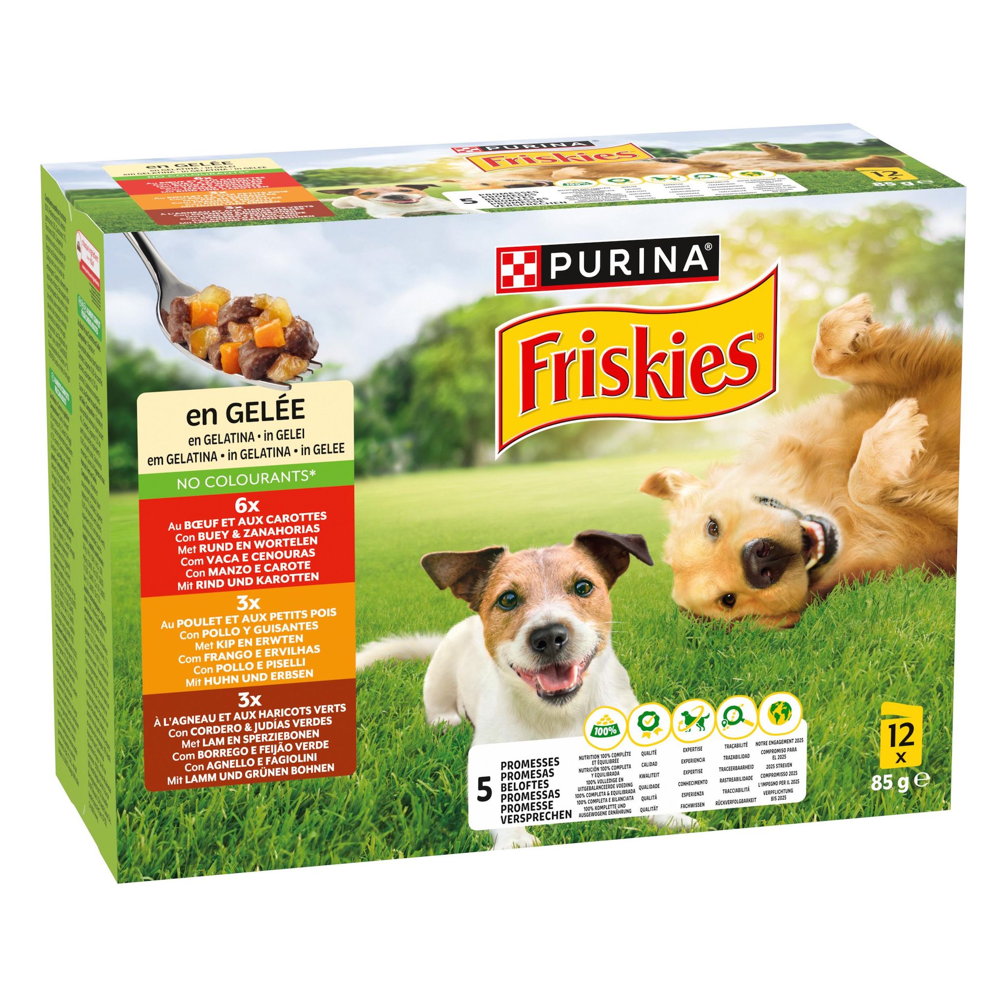 Les 5 Promesses FRISKIES. Depuis le jour où vous avez accueilli votre chien chez vous, vous avez pris un engagement, fait la promesse de prendre soin de lui, de bien le nourrir. Chez FRISKIES nous avons fait la même promesse. Nous mettons à profit notre expertise afin de garder votre chien heureux et de l'aider à rester en bonne santé. 5 promesses nous tiennent à cœur : - Nutrition : Une savoureuse recette 100% complète et équilibrée, élaborée avec des protéines animales de qualité - Qualité : Des centaines de contrôles quotidiens sont effectués tout au long de notre processus de production - Expertise : Tous nos produits sont développés par les nutritionnistes PURINA - Traçabilité : Nos recettes sont préparées avec des ingrédients de haute qualité, rigoureusement sélectionnés provenant de fournisseurs de confiance - Notre engagement 2025 : Nous nous engageons à rendre nos emballages 100% recyclables ou réutilisables d'ici 2025 Toutes les recettes sont sans colorants et sans arômes et conservateurs artificiels ajoutés.