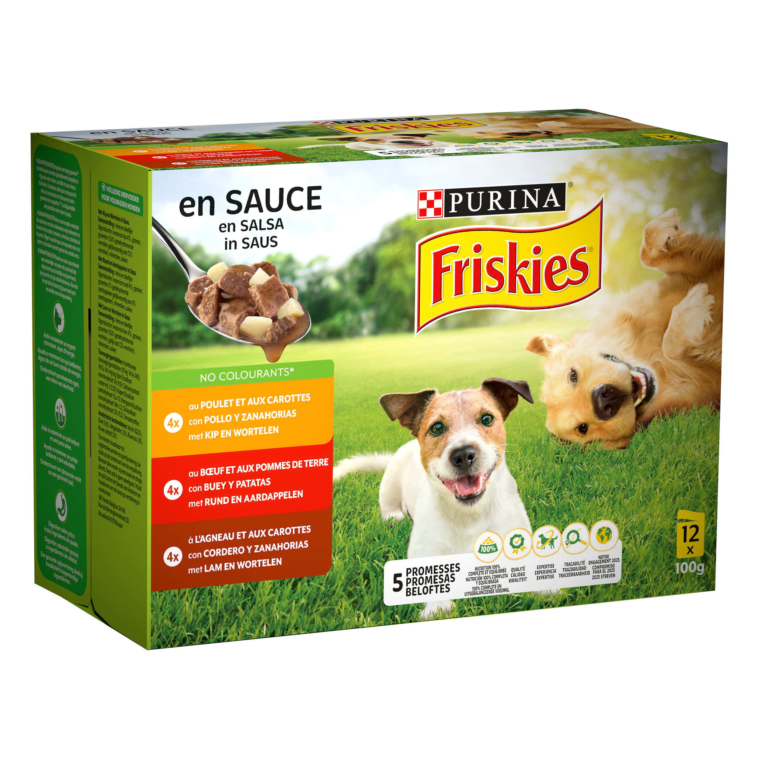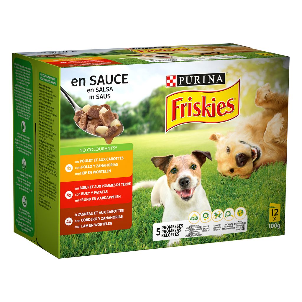 Les 5 Promesses FRISKIES® Depuis le jour où vous avez accueilli votre chien chez vous, vous avez pris un engagement, fait la promesse de prendre soin de lui, de bien le nourrir. Chez FRISKIES®, nous avons fait la même promesse. Depuis plus de 50 ans, FRISKIES® nourrit des générations des de chiens heureux et en bonne santé grâce à une alimentation savoureuse et de qualité. C'est une grande responsabilité. Tout comme vous, chez FRISKIES® nous tenons nos engagements et 5 promesses nous tiennent à cœur : 1) Nutrition : Une savoureuse recette 100% complète et équilibrée, élaborée avec un mélange de protéines animales et végétales, comme les céréales. 2) Qualité : Des centaines de contrôles quotidiens sont effectués tout au long de notre processus de production. 3) Expertise : Tous nos produits sont développés par les nutritionnistes PURINA. 4) Traçabilité : Nos recettes sont préparées avec des ingrédients de haute qualité, rigoureusement sélectionnés provenant de fournisseurs de confiance. 5) Notre engagement 2025 : Nous nous engageons à rendre nos emballages 100% recyclables ou réutilisables d'ici 2025. Toutes les recettes FRISKIES® sont sans colorants, arômes et conservateurs artificiels.