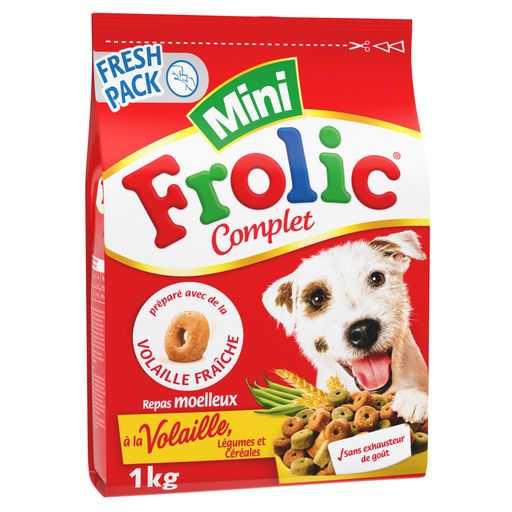 Aliment complet pour chiens adultes. Les croquettes Frolic® Mini sont simplement délicieuses, adaptées aux petits chiens et complètes d'un point de vue nutritionnel. Un bol de Frolic® Mini, préparé avec de la volaille fraîche, des légumes, céréales, des vitamines et des minéraux, apportera chaque jour à votre chien joie de vivre et vitalité. De plus, les croquettes Frolic® ne contiennent pas d'exhausteur de gôut : elles sont simplement délicieuses! Tout ce dont votre chien a besoin dans chaque croquette !