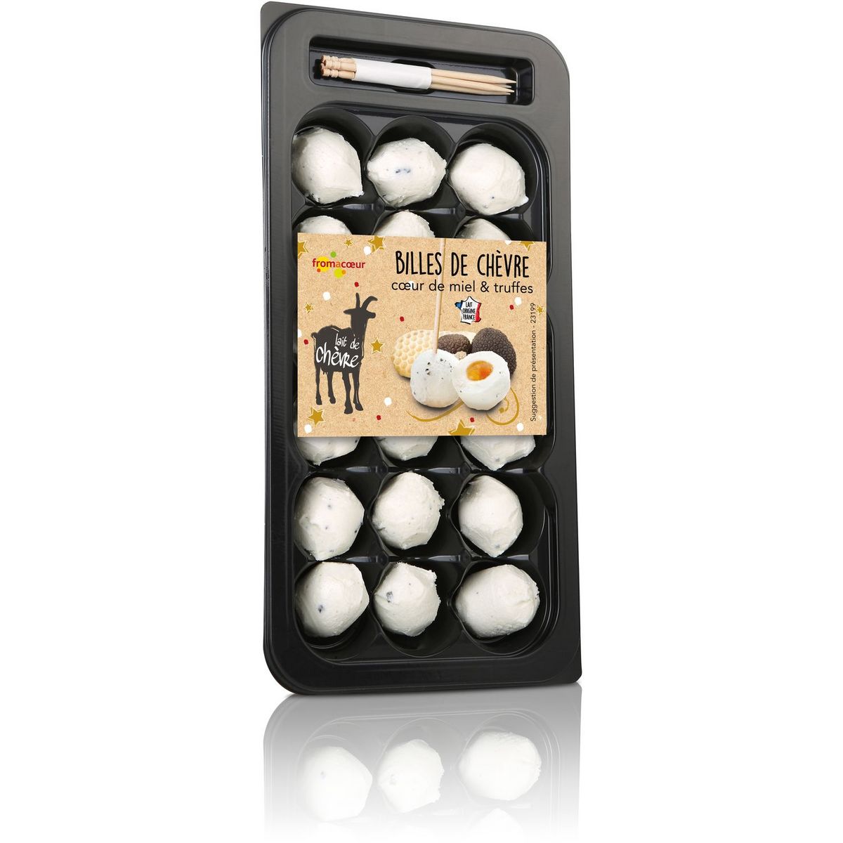 Petite boule de fromage de chèvre frais à la truffe fourrée au miel.